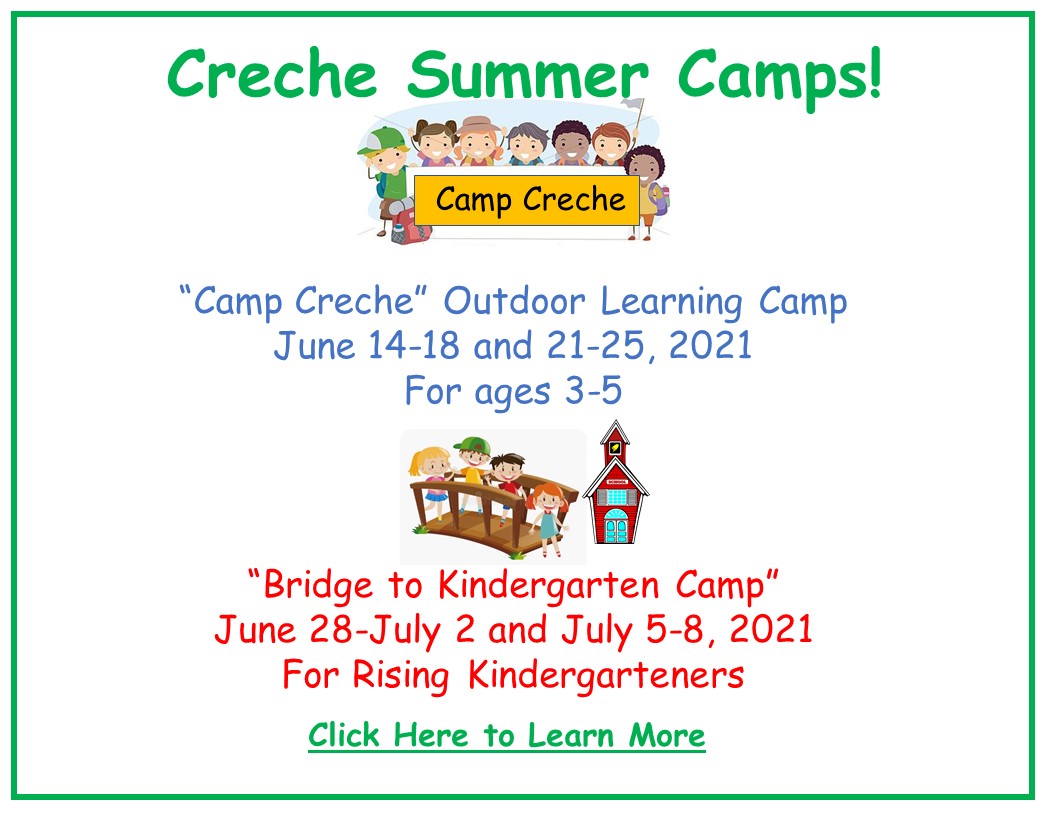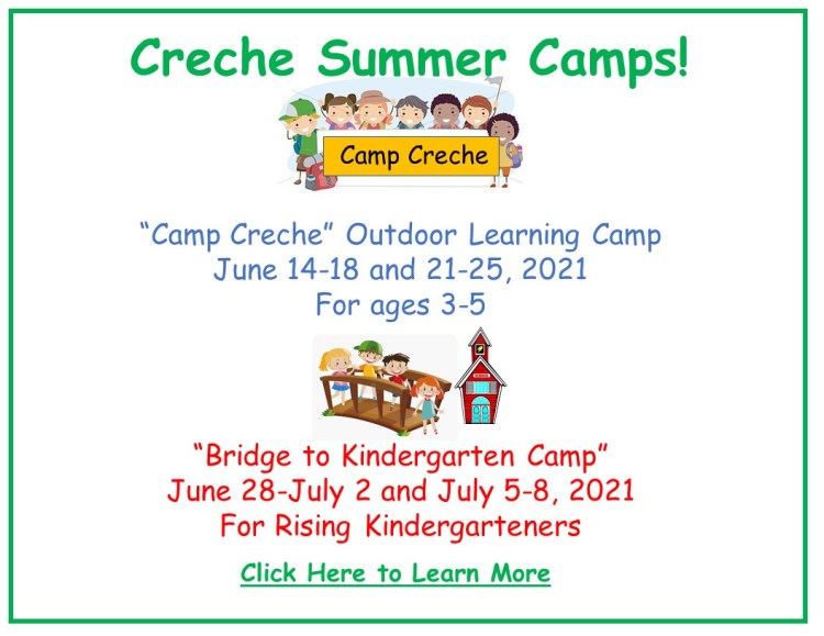 The Creche Preschool will be offering two summer camps this year. Both camps will be two week camps. The Cost for each camp is: – $600 if paid after May 4, 2021.